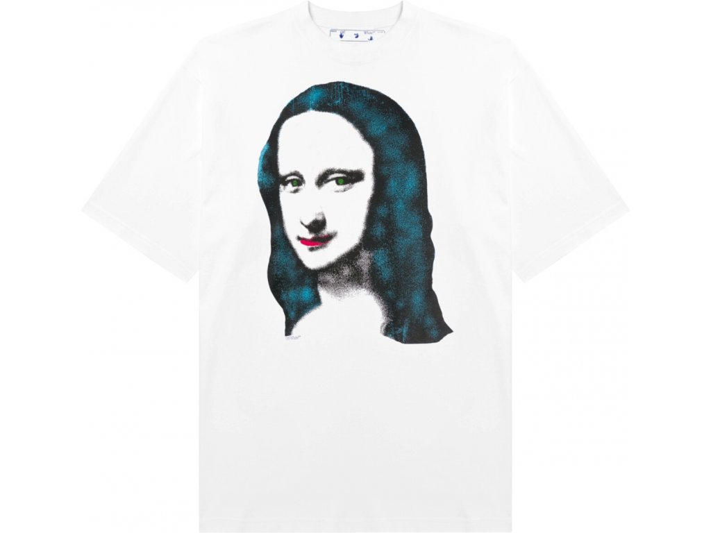 Off-White pokračuje v přebírání příkladů z ikonických uměleckých děl po spolupráci s Louvrem a na řadě je Mona Lisa Leonarda da Vinciho pro toto nadměrné bavlněné tričko. Obraz se objevil na minulých dílech Virgila Abloha, ale on k této verzi zaujímá pop-artový přístup a tiskne jej ve stupních šedi s jasně modrými vlasy, zelenýma očima a červenými rty přes vrchol. Pro podpis je na zadní straně vyražen PIVOT – název kolekce Pre-Fall 2020 – tučným písmem.