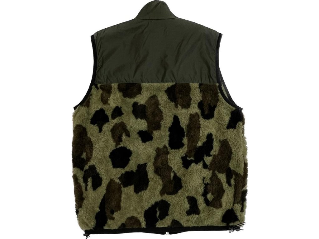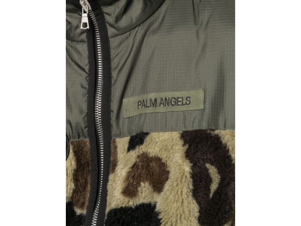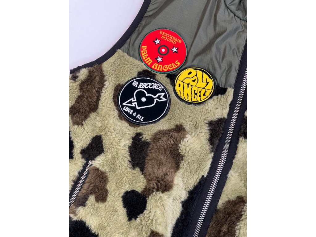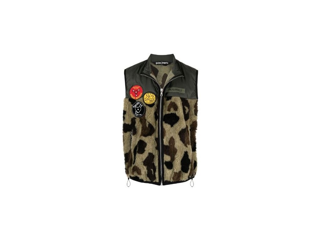 Vojenská zelená/vícebarevná bavlněná vesta Records Pile od PALM ANGELS s panelovaným designem, detaily z umělé kožešiny, leopardí potisk, vyšívané logo na hrudi, stojáček, přední zapínání na zip, bez rukávů, dvě boční kapsy na zip a rovný lem.