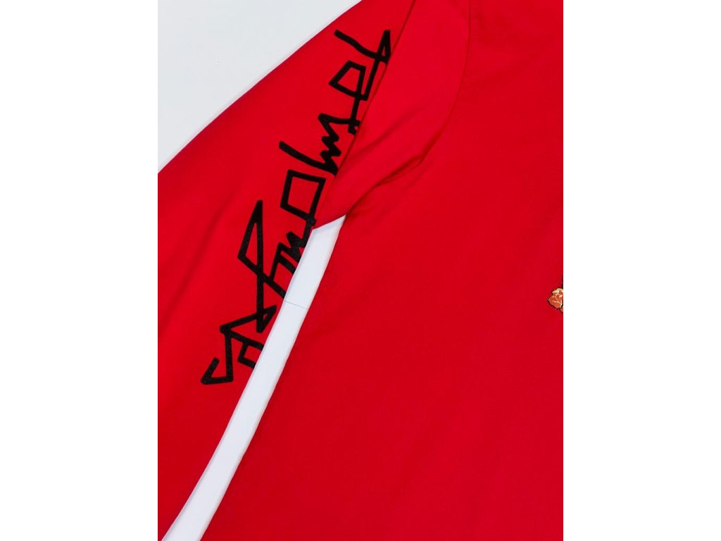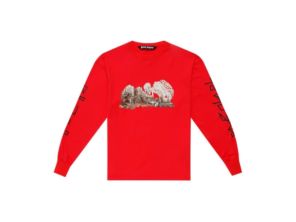 ČERVENÉ TRIČKO S DLOUHÝMI RUKÁVY S VÍCEBAREVNÝM GRAFICKÝM POTISKEM POUŠTNÍ LEBKY V PŘEDU. LOGO POUŠTĚ "PALM ANGELS" TIŠTĚNÉ NA RUKÁVY. LÍMEC S VRCHNÍM VÝKRKEM.