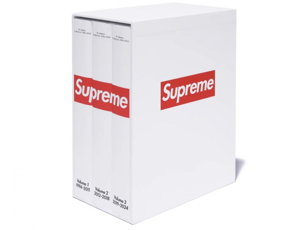 Třídílná plnobarevná fotokniha dokumentující každé tričko vydané v 30leté historii Supreme. Prodává se jako sada v pevném kufříku.