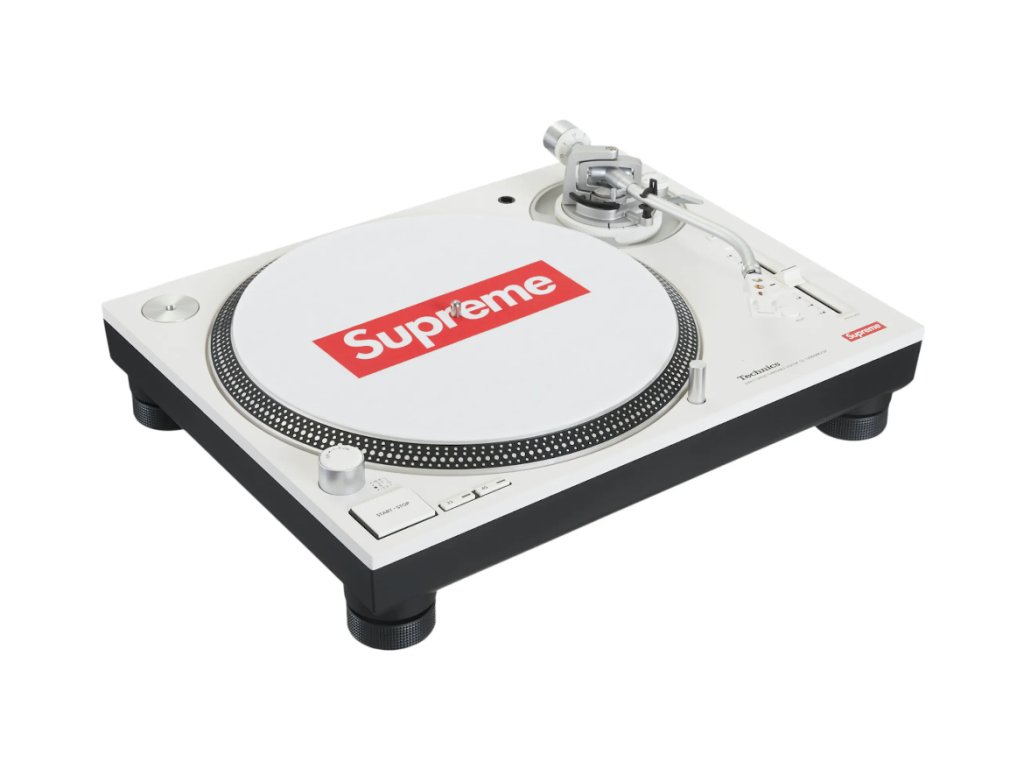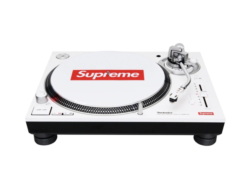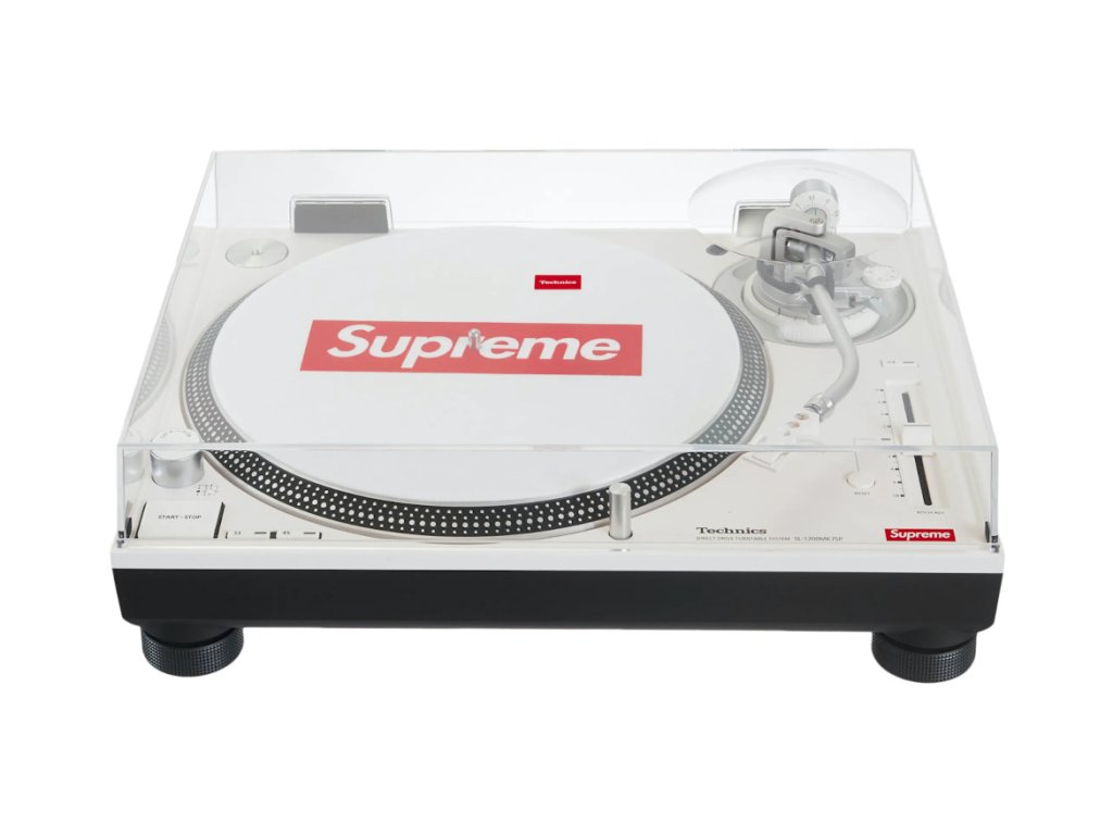 Supreme Technika Gramofon Supremes/Technics SL-1200MK7 DJ gramofon Technics řady SL-1200. Disponuje bezjádrovým motorem s přímým pohonem, talířem tlumícím vibrace, rychlostí 78 ot./min s širším nastavením sklonu, funkcí zpětného přehrávání a odnímatelnými kabely. Protiprachový kryt bez pantů s tištěnými logy. Vložený kovový odznak na základně a tištěná loga na slipmatu. 17,8" x 6,7" x 13,7". 21 lb.