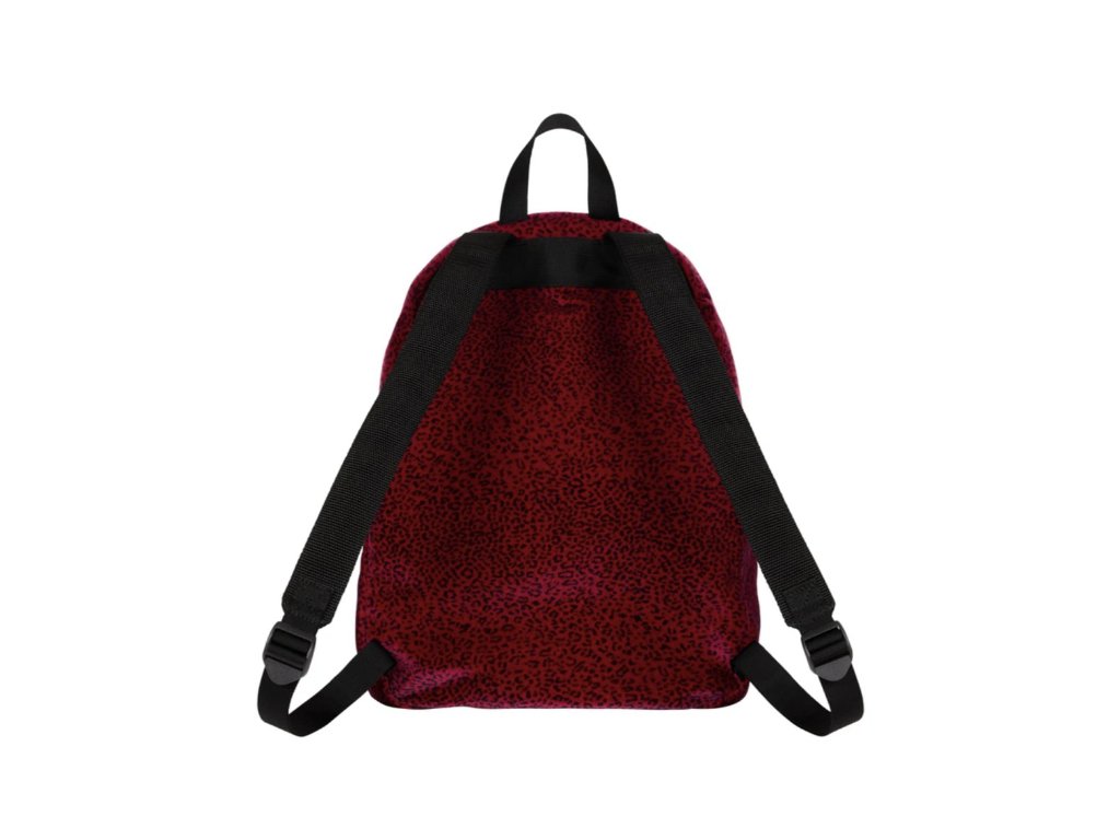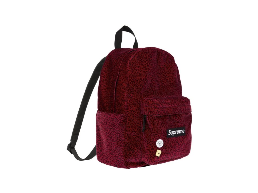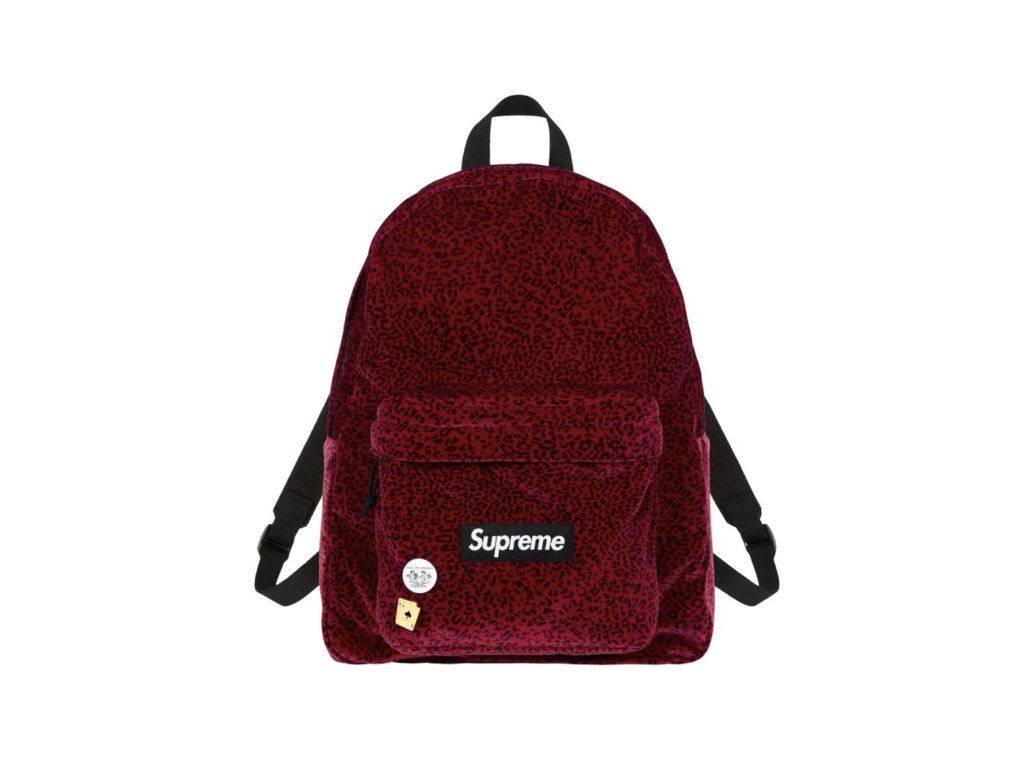 Supreme batoh z nylonu s velvetovým flockingem a podšívkou z bavlněného ripstopu. Hlavní přihrádka na zip + přední kapsa na zip pro drobnosti. Na přední straně tkaný štítek s logem. Součástí balení je také kovový pin a odznak.