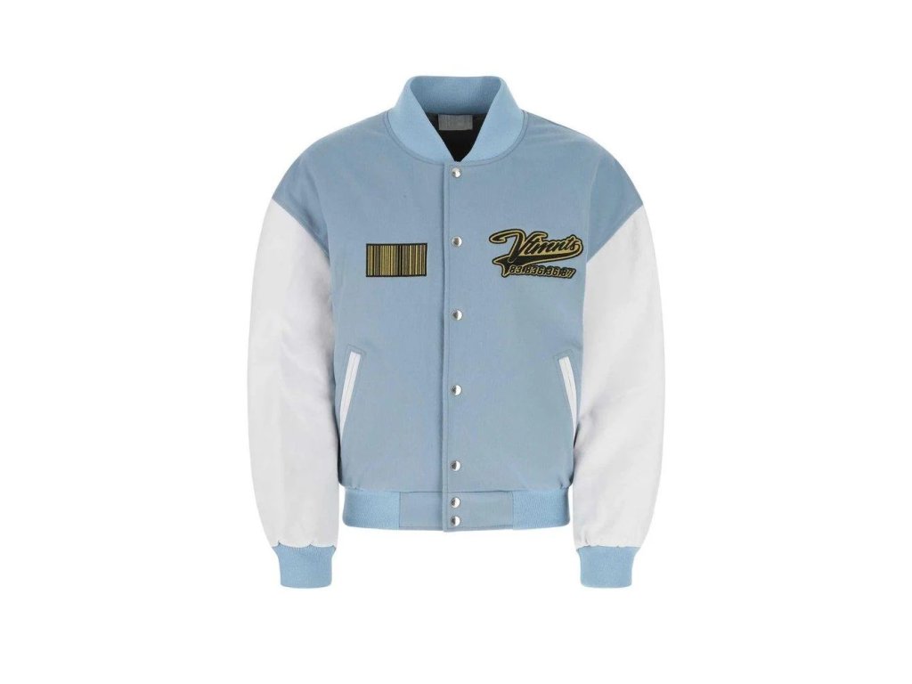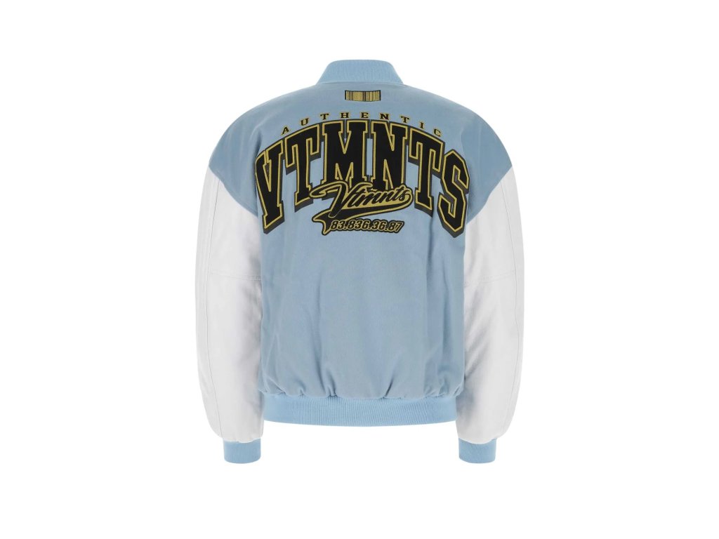 Modrá/bílá vlněná kožená bunda s vyšívaným logem od vtmnts s vyšívaným logem na hrudi vyšívaným logem na zadních rukávech z kontrastní látky, dvěma předními kapsami s tryskami a předním zapínáním na knoflíky.